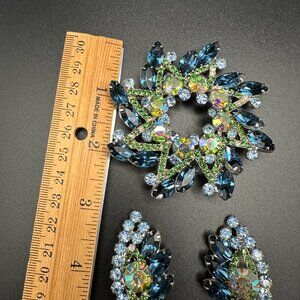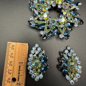Vintage Juliana D&E Large Blue Rhinestones Brooch and Clip on Earrings Set