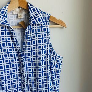 This eye-catching vintage mini dress features a sleeveless silhouette, mod-inspired geometric pattern in vibrant blue and white, and a flattering fitted cut. With clean lines and stretch comfort, it’s easy to wear and hard to forget.