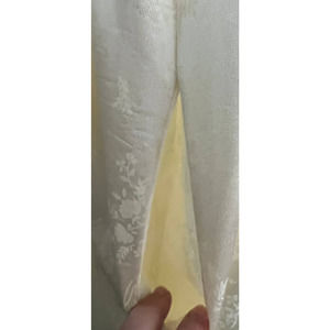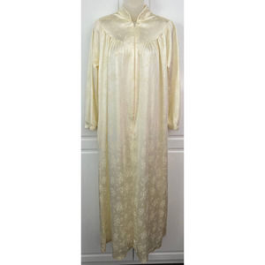 Robe features long sleeves with elastic at the cuff, a side seam pocket on the right, and a 1/2 zip closure. It is cream colored with a tonal floral pattern. Made from 80% acetate, 20% polyester. Machine washable.