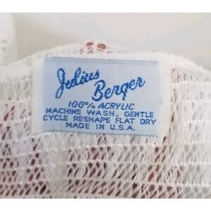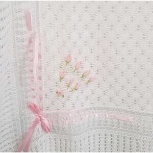 Vintage Julius Berger White Knit Pink Rosettes Ribbon Accents 37" Baby Blanket. Excellent pre-owned condition with no rips, stains or tears