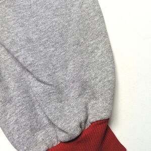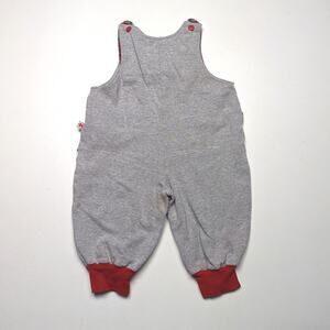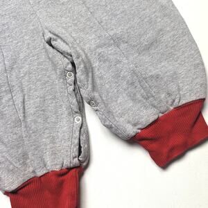 Vintage gray sweat-like bubble romper with coordinating red plaid details. Tagged size 24m, but looks to fit better as 18-24m.