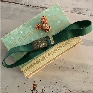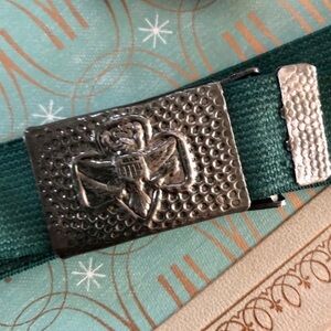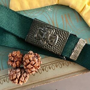 Vintage 1960’s Junior Girl Scout uniform accessory. Hunter green elastic web belt with gunmetal stamped hardware slide buckle.