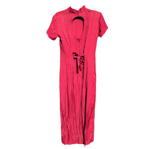 Vintage Just Choon Solid Burgundy Mandarin Collar Short Sleeve Front Slit Bodycon Maxi Dress