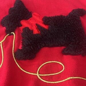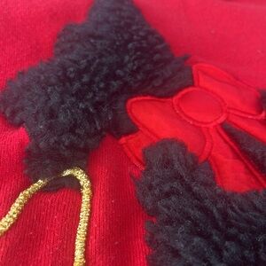 Features: Faux-fur Scottie appliqué, gold leash embroidery, ribbed cuffs and hem