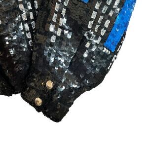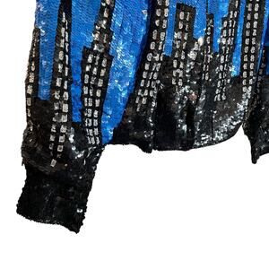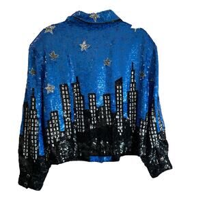 • Features: Snap button up closure with bottom clasp closure, Shoulder pads, Lined, Full sequin outer in vibrant blue with black city scene and silver moon and stars on upper, Snap buttons at cuffs, Collared