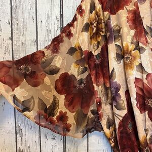 The satin jacquard fabric is a stunning floral pattern in reds, gold, and purple against a gold background.
