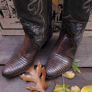"Justin Boot Company uses the belly of the lizard to allow proper breaking of the lizard skin as you walk. The scales and membranes of lizard boots give a natural bend as your foot moves." Lizard skin boots have been considered a good Western Dress boot for years. Dress up, or down.