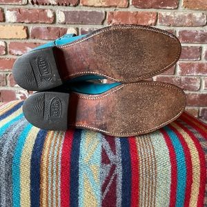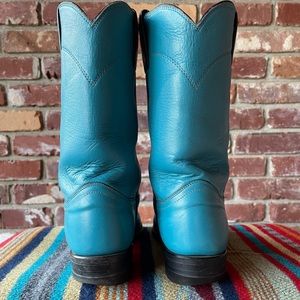 U.S.A. Made, turquoise, distressed, 90’s vintage Justin ropers, style 3084, narrow, size 6B, registration number 43668, heel to top 10.5”