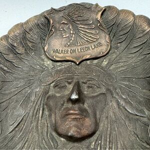 Vintage K & O Native American Indian Chief souvenir pin tray ash tray. Made from cast metal as a souvenir from Walker on Leech Lake by the Kronheim & Oldenbusch (K&O) company this beautifully ornate pin tray depicts a native American in high relief on the front. His head dress extends to the edge of the dish to act as a feather edge with an overlaid shield on top depicts the town and image of a Buffalo. This piece dates to the late 1940s