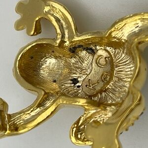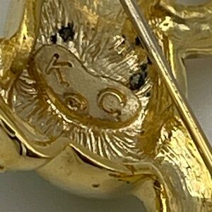 Add a touch of whimsy to your jewelry collection with this vintage KC brooch featuring a charming frog design. Crafted from gold-tone metal, this brooch is adorned with green rhinestones and a faux cat eye jelly belly for added sparkle. The cabochon-shaped main stone and animal theme make this brooch a perfect gift for Mother's Day, Christmas, or a birthday. Measuring at 2.25 inches in length, this fashion jewelry is perfect for women who love unique and rare finds. The brooch is in excellent vintage condition and would complement any outfit, whether it's formal or casual. Get this one-of-a-kind brooch now and add it to your collection of vintage and antique jewelry.