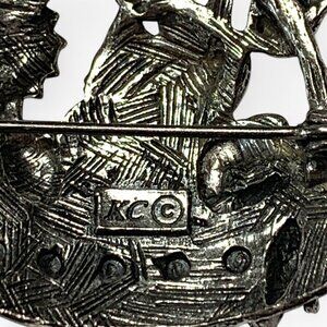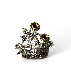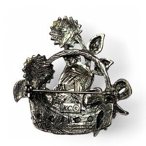 Charming brooch featuring a cat in a basket with sunflower accents and a delicate bow, adorned with rhinestones for subtle sparkle. Marked KC on the reverse. Working pin clasp. Approx 2". Excellent vintage condition. See photos for more details.
