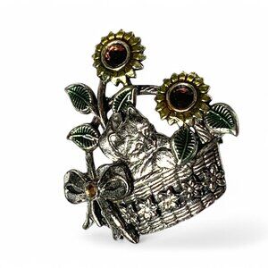 Vintage KC Cat In Basket Brooch With Sunflowers & Bow Silver-Tone Rhinestones 2"