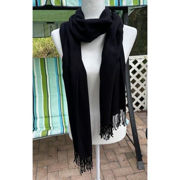 Vintage KC Malhan Black 100% Silk Scarf Beaded Fringe 84 inches Length Luxury