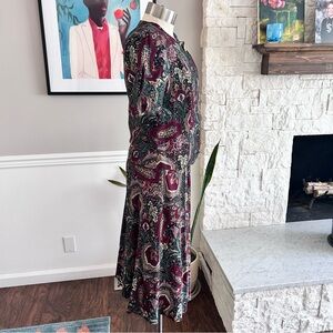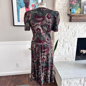 Vintage K.C. Spencer 2-Piece Set Paisley Burgundy 80s Office Wear Size Medium. Button front short sleeve top with matching midi skirt. Skirt has elastic waist. Top has removable shoulder pads. Made in USA. Size tag reads 12 but measures modern day size medium. Check measurements to ensure desired fit.