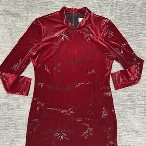Preowned dress with light general wear to the velvet pile from normal use. No obvious stains, holes, or missing embellishments seen on inspection. Back zipper and decorative buttons work properly and lining is intact.
