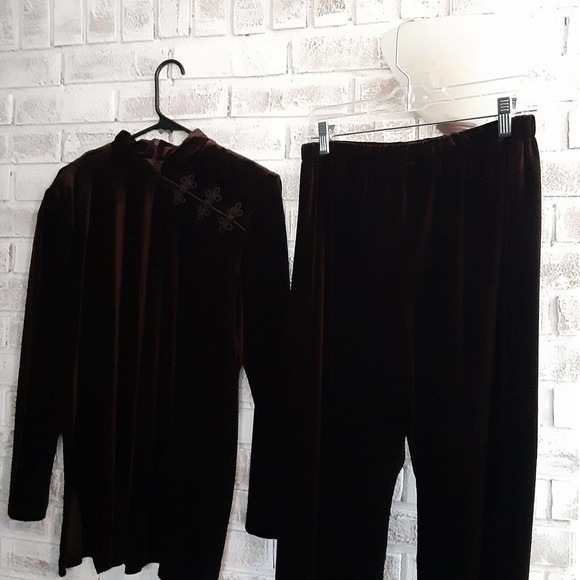 This vintage two-piece velour set by K.C. Spencer New York is perfect for any petite woman who wants to make a statement. The set includes a top and pants, both featuring beautiful embroidery details, shoulder pads, and a mandarin collar. The dark chocolate color adds a touch of elegance to the outfit. This set is perfect for any occasion, whether you're dressing up for a night out or just running errands. The fabric is soft and comfortable, making it easy to wear all day long. Don't miss out on the chance to own this unique and stylish vintage set.Nape zip,elastic band waist, long sleeve,& Needlework applique.Approximate measurements: TOP-under arms-40 length-29" Bottoms- waist-28" un-stretched rise-12.25"inseam-28"
