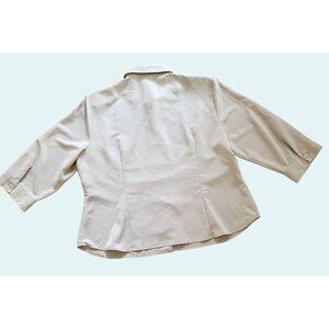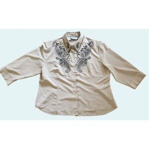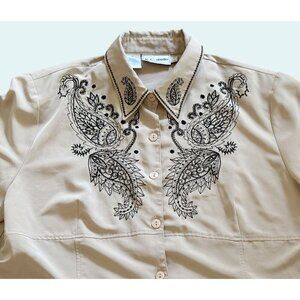 Cool vintage blouse by KC Studio. Circa 90s / 00s. Full button. Tan with black embroidery details. 100% polyester. Tag is a size 16. Listed as a size based on measurements. Pre-owned and gently worn in really nice condiiton!