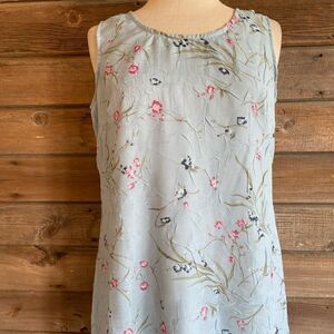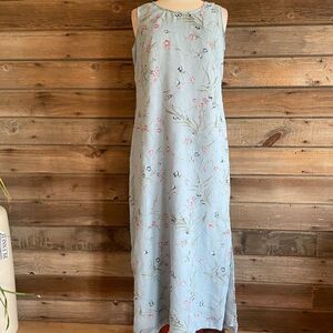 Love this gorgeous maxi dress featuring a beautiful floral design over light blue. It measures 19 inches armpit to armpit laying flat and 52 inches in length from shoulder to hem.