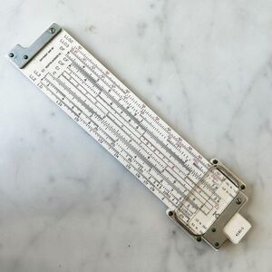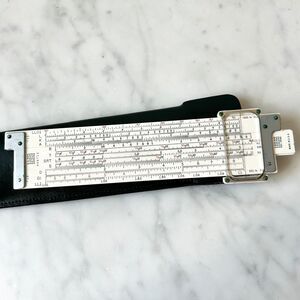 Vintage 1940s K+E Keuffel & Esser pocket slide rule 4181-1. Slide rule is in original box with leather sleeve, manual and care instructions. Excellent vintage condition.