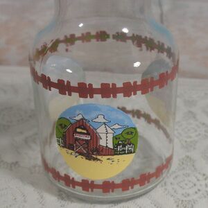Add a charming country farmhouse touch to your kitchen or dining space with this set of two vintage glass juice carafes by KIG Indonesia. Each pitcher features a cheerful barnyard scene repeated three times around the body, with vivid red fencing detail wrapping the design.