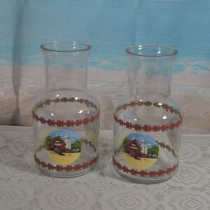 Crafted from sturdy glass and standing approximately 9" tall, these carafes are ideal for serving juice, milk, iced tea, or simply using as decorative kitchen accents. They're in very good vintage condition with no chips or cracks.