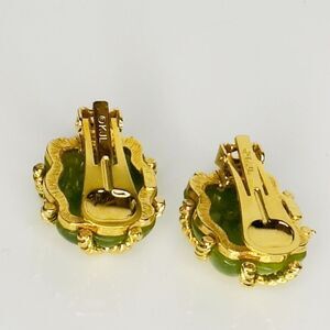 These vintage Kenneth J Lane earrings are a perfect addition to any jewelry collection. The gold rope and quilted caged design beautifully complement the Avocado Green resin stone. These clip-on earrings are perfect for any occasion, including Mother's Day, Christmas, Wedding, Anniversary, Birthday, or Valentine's Day. The designer statement earrings are signed and feature a button style, making them both glamorous and fashionable. The materials used to create these earrings are resin and metal with a yellow gold plating. These earrings are perfect for anyone who loves vintage jewelry from the 80s.
