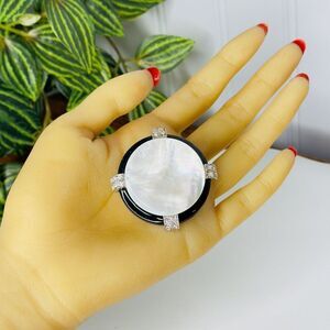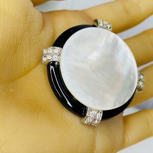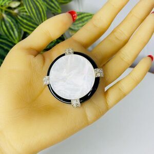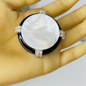 This Vintage Kenneth Lane Brooch is a stunning piece of art deco jewelry with a unique design that features enamel and rhinestone detailing. The brooch is a great gift choice for special occasions like Mother's Day, Christmas, Wedding, Anniversary, Birthday or Valentine's Day. The round shaped mother of pearl stone adds an elegant touch to the brooch.