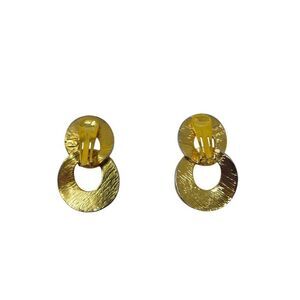 These vintage KJL (Kenneth Jay Lane) clip-on earrings feature a chic boho-inspired design with two interlocking, textured gold-tone rings. The textured finish adds depth and elegance, making these 2" statement earrings perfect for both casual and formal looks. Crafted from all metal with a hallmark indicating KJL authenticity, these earrings are a versatile addition to any jewelry collection.
