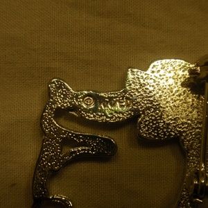 Adorable cat is wearing a blue enameled bow and has a moving articulated tail. So cute! Marked KK/ED with © symbol. Excellent condition with little to no signs of wear.