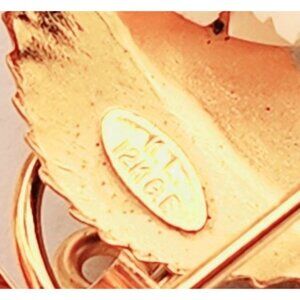 Elegant vintage brooch featuring a creamy rose goldtone circle adorned with green enamel leaves. Perfect for adding a touch of classic charm to any outfit, this brooch is a timeless accessory for any occasion.