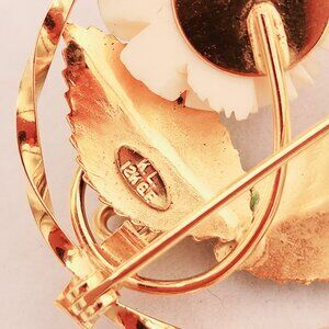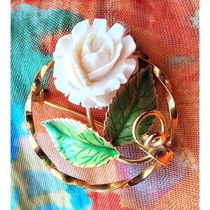 Vintage "KL" Celluloid Creamy Rose 12K GF Circle Brooch W Green Enamel Leaves