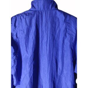 Lightweight royal blue nylon with sheen fabric. Shoulder pads. Oversized. Features snap closures, elastic hem, and functional side pockets.