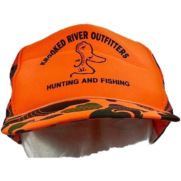 Vintage KROOKED RIVER Outfitters Trucker Hat Cap Snapback Orange Camo Hunting