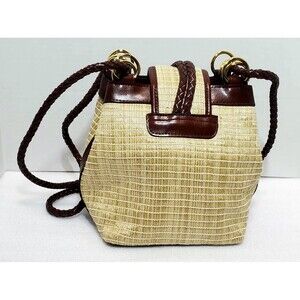 This stylish vintage shoulder bag features a woven straw body with rich brown leather trim and a distinctive closure design that adds character. A perfect accessory for boho, beachy, or casual looks.