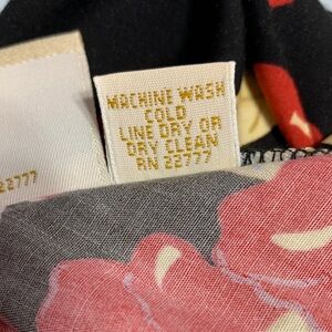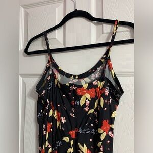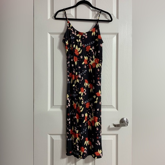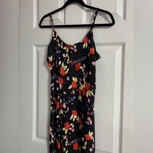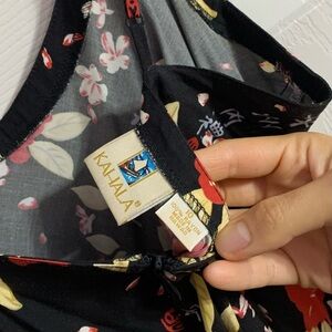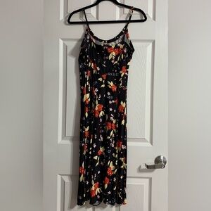 Cute vintage Y2K floral/Asian themed midi dress - black background with red and white hibiscus flowers