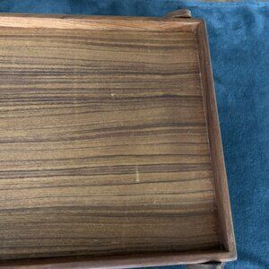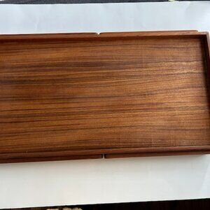 Vintage (1987) Kalmar Designs teak wood folding breakfast tray. 22-1/2" long on the inside; 23-1/2" long with outer rim. 11-3/8" wide on the inside; 12-1/2"w with outer rim. 10-1/14" high. In very good condition; a handful of small markings on the tray from use.