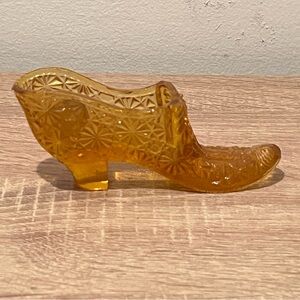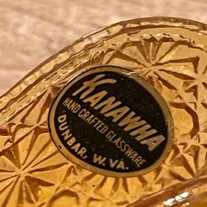 This vintage Kanawha amber glass slipper is a beautifully crafted figurine from the mid 20th century. Made in the USA by Kanawha Glass Co., this art glass piece features a charming cabbage rose design in a striking amber color. Measuring 5 inches in length, this figurine would make a lovely addition to your glassware collection. In fantastic condition. Please see all photos for details for they serve as part of the description. And please feel free to check out some of my other listings for bundling deals.