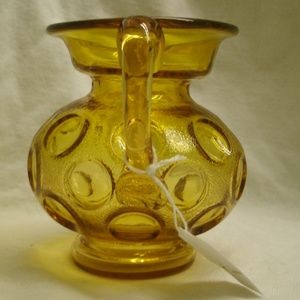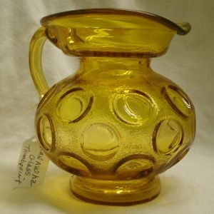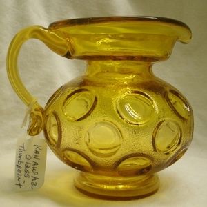 Vintage pitcher/creamer made by Kanawha Glass in Dunbar, WV. Mid century. Amber color. Thumbprint pattern. Body is textured between thumbprints. Handle was added by hand. It is about 4 1/4 inches high, about 4 1/2 inches across handle way, and 3 1/4 inches wide at body. Very pretty. Good condition - no chips or cracks. Great for collectors of this manufacturer or of pitchers/creamers.