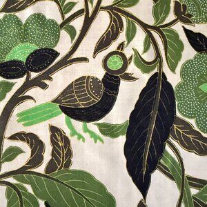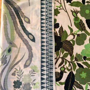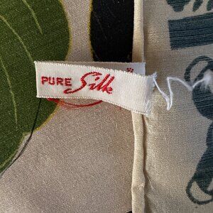 Vintage Kanebo Japanese Peacock and Floral Silk Scarf. Beautiful large scarf with a peacock and floral design in hues of light green, dark green, yellow, black, and ivory. Pretty border in black and ivory with a geometric pattern that includes hearts and single stem flowers. Rolled edge. Tag with Kanebo and 100% silk. Good vintage condition. A few light stains on the cream section of the fabric. They look like light oil type stains. A little fraying on the tag. See the last two pictures. One linear mark. I'm not sure what caused this. See the 3rd to last picture. Approximately 32" X 32"