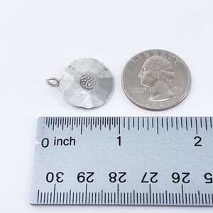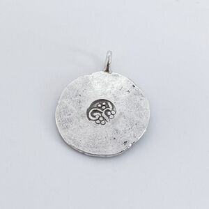 This handcrafted Karen Hill Tribe pendant features a stylized Om symbol at its center, representing peace and spiritual balance. The textured silver disc has an organic, rustic finish, highlighting the artisanal craftsmanship. A unique piece, perfect for yoga enthusiasts or those drawn to mindful and symbolic jewelry.