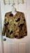 Elevate your wardrobe with this stunning women's jacket featuring a luxurious gold and purple pattern. Perfect for adding a touch of elegance to any ensemble. The interior is polyester lined Tiny flaw armpit on the interior lining discoloration. The color is gold and a purple burgundy. Great preloved condition. See pictures for further inspection. Approximate measurements pit to pit 21” and shoulder to hem 26”