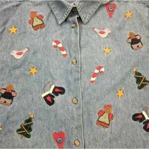 Vintage Karen Scott Denim / Chambray Button Up Christmas Embroidered Shirt