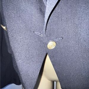 Stylish black blazer featuring gold buttons. Perfect for a chic look.
