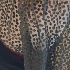 Made in the USA. Union made. Elegant black velvet dress by Karen Lucas for Niki. Sweetheart neckline dress in soft black velvet. Fit and flare dress with a net petticoat lining. The top of the bodice is sheer with flocked polka dots and sparkles. The back has a deep keyhole opening. Long sheer sleeves. Nude shoulder pads. Size 4 measures 34 at chest, 26 at waist, full skirt. 41 long from shoulder to hem. Perfect for any special occasion.