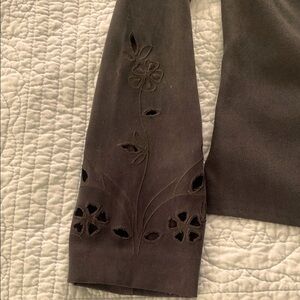 Chic green jacket by Karin Stevens. Features elegant floral cutouts on the collar and sleeves as well as a flattering back. Lightweight. Includes shoulder pads. Measures 19” across chest, 15” shoulders, 21.5” shoulder to hem, and 23” sleeves. Vintage sizing. Please check measurements before purchasing and check tag photo for most accurate color.