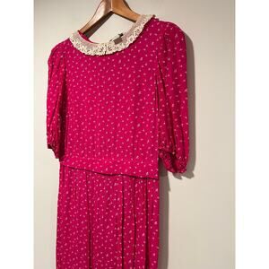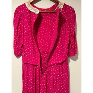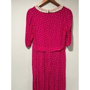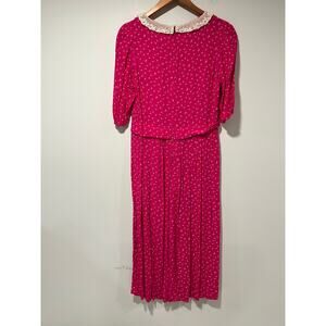 Vintage Karin Stevens Short Sleeve Rayon Midi Dress Lace Trim Hot Pink Sz 8 JL