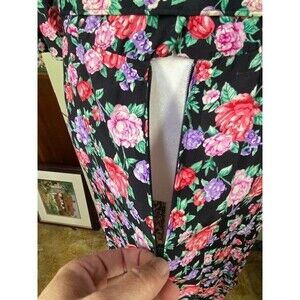 This Vintage Karin Stevens midi dress is perfect for any occasion, whether it's a party or a casual day out. The dress features a beautiful floral pattern, 3/4 sleeves, and a round neckline with a pullover closure. The fit & flare style is accentuated with a belted waist, giving you a flattering silhouette. Made with 100% rayon knit fabric, this dress is both comfortable and stylish. It also includes unique accents like buttons and a zipper, as well as practical features such as pockets and shoulder pads. The dress has a collarless design and is dry clean only. This cottagecore dress is perfect for any season, be it winter, summer, fall, or spring.