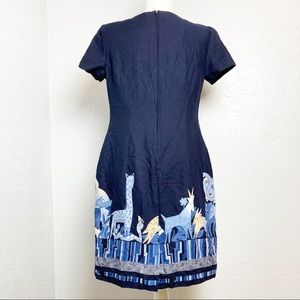 Vintage Karin Stevens dress. Blue Giraffe and Animal design. Short sleeve. Knee length. Sheath dress. Fully lined. Zipper back. Size 10. Pit to pit measures 19” length measures 35”.