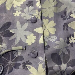 This Vintage Karin Stewart top in size 12 features a sheer floral design in purple and white. It has short sleeves with a classic/fitted style, a collared neckline, and button accents. Made of polyester, this button-up top has a regular fit and a vintage appeal.