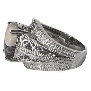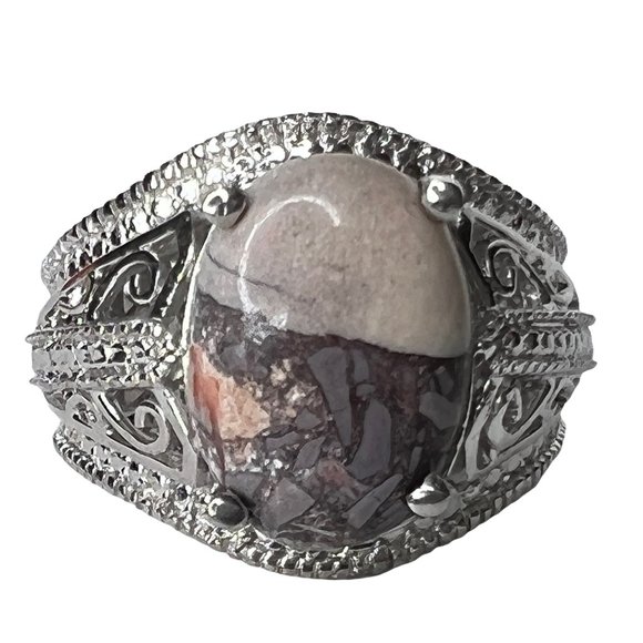This vintage Karis STS sterling silver ring (Size 8) features a bold oval brecciated jasper cabochon with a natural mosaic pattern in earthy gray, mauve, and beige. Crafted in genuine .925 sterling silver with a platinum bonded finish for lasting shine, it has an ornate filigree setting that gives it timeless boho flair